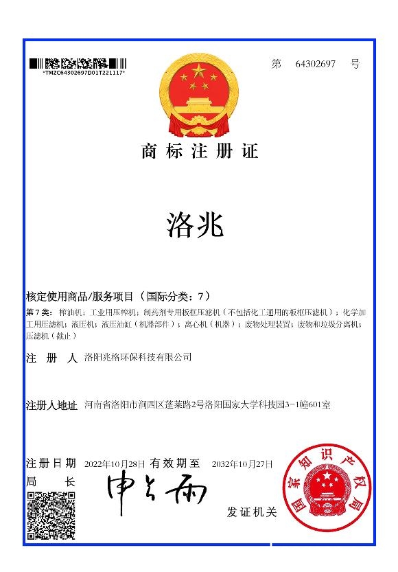 “洛兆”商標注冊成功后將用于兆格環(huán)保自主研發(fā)銷售的液壓榨油機、全自動液壓榨油機、固液分離設備等產(chǎn)品的市場推廣。