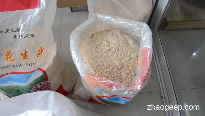 這個(gè)就是客戶前每天集中粉碎后的花生面,采用編織袋裝著。