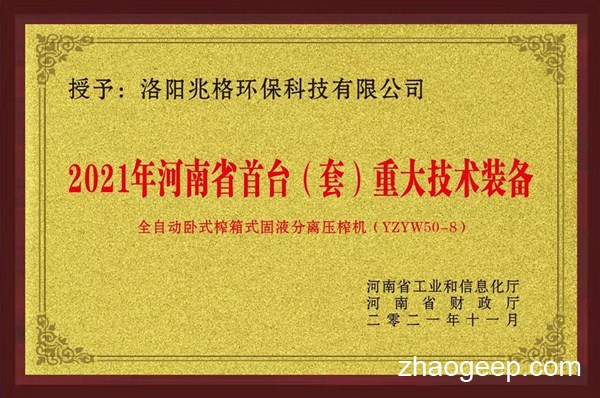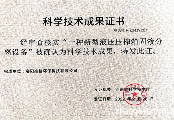 洛陽兆格環(huán)保科技有限公司自成立以來,經過幾年的努力,分別獲得了“國家科技型中小企業(yè)”和“國家高新技術企業(yè)”2項國家級榮譽;“河南省首臺(套)重大技術裝備“認定”和“科學技術成果“認定等省級榮譽以及”洛陽市固液分離液壓機企業(yè)研發(fā)中心“認定和”洛陽市專精特新中小企業(yè)”認定等市級榮譽。
