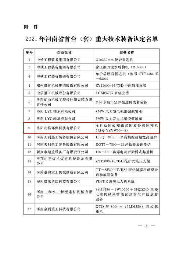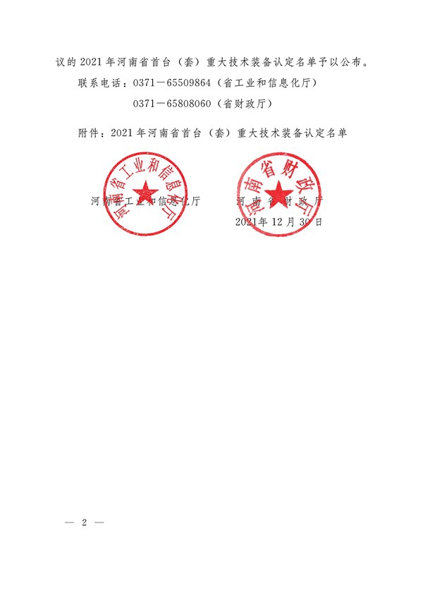 2021年11月獲得河南省工業(yè)和信息化廳以及河南省財政廳”河南省首臺(套)重大技術裝備“認定