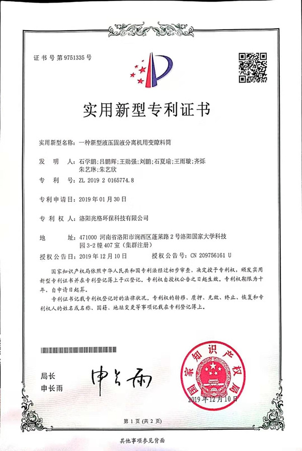 該裝料結(jié)構(gòu)我公司申請有實用新型專利,專利名稱“一種新型液壓固液分離機用變隙料筒”,專利號“ZL 2019 2 0165774.8”。